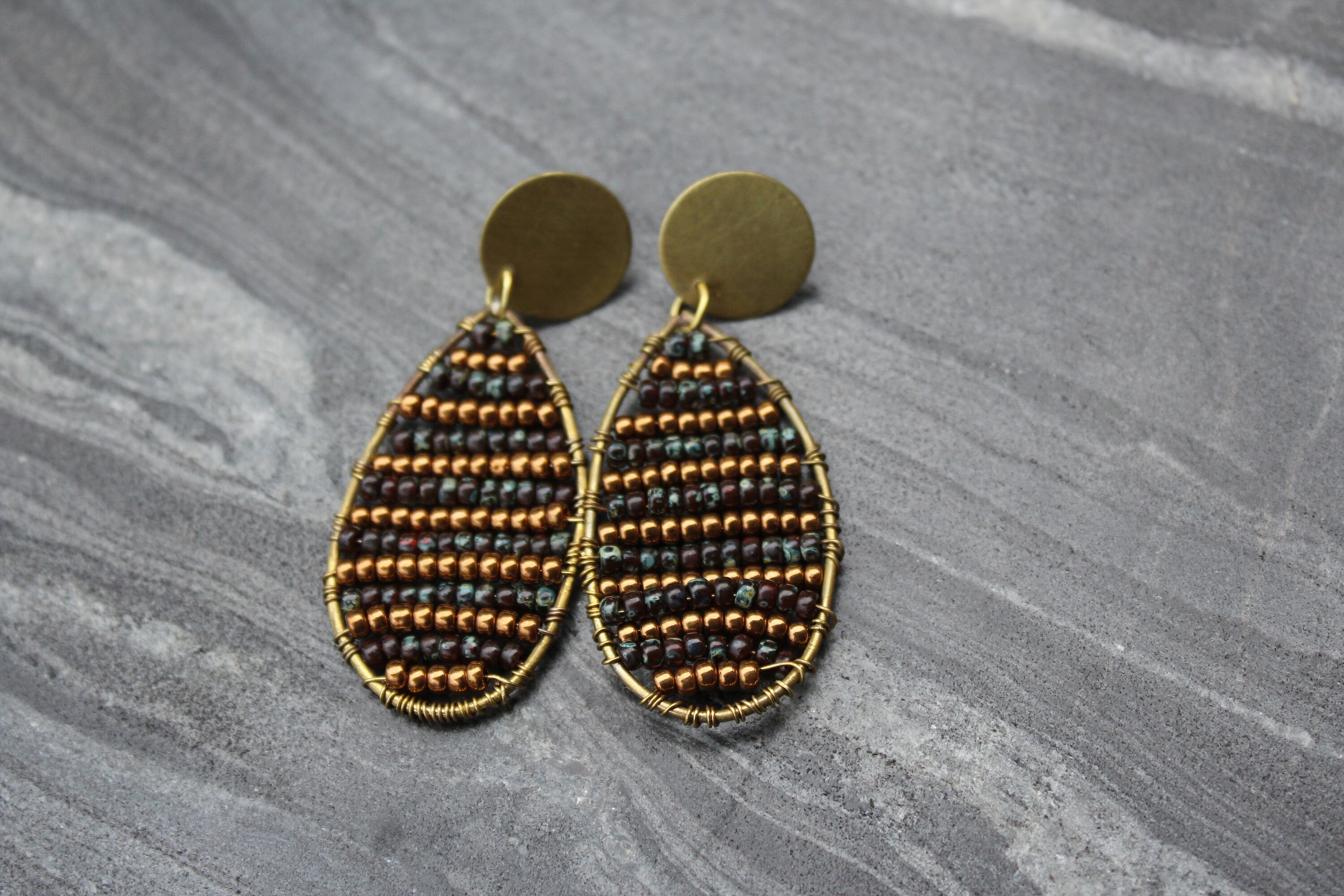 I designed and hand made these gupsy earrings, using bronze wire and fine japanese glass beads. Closure is sterling silver.