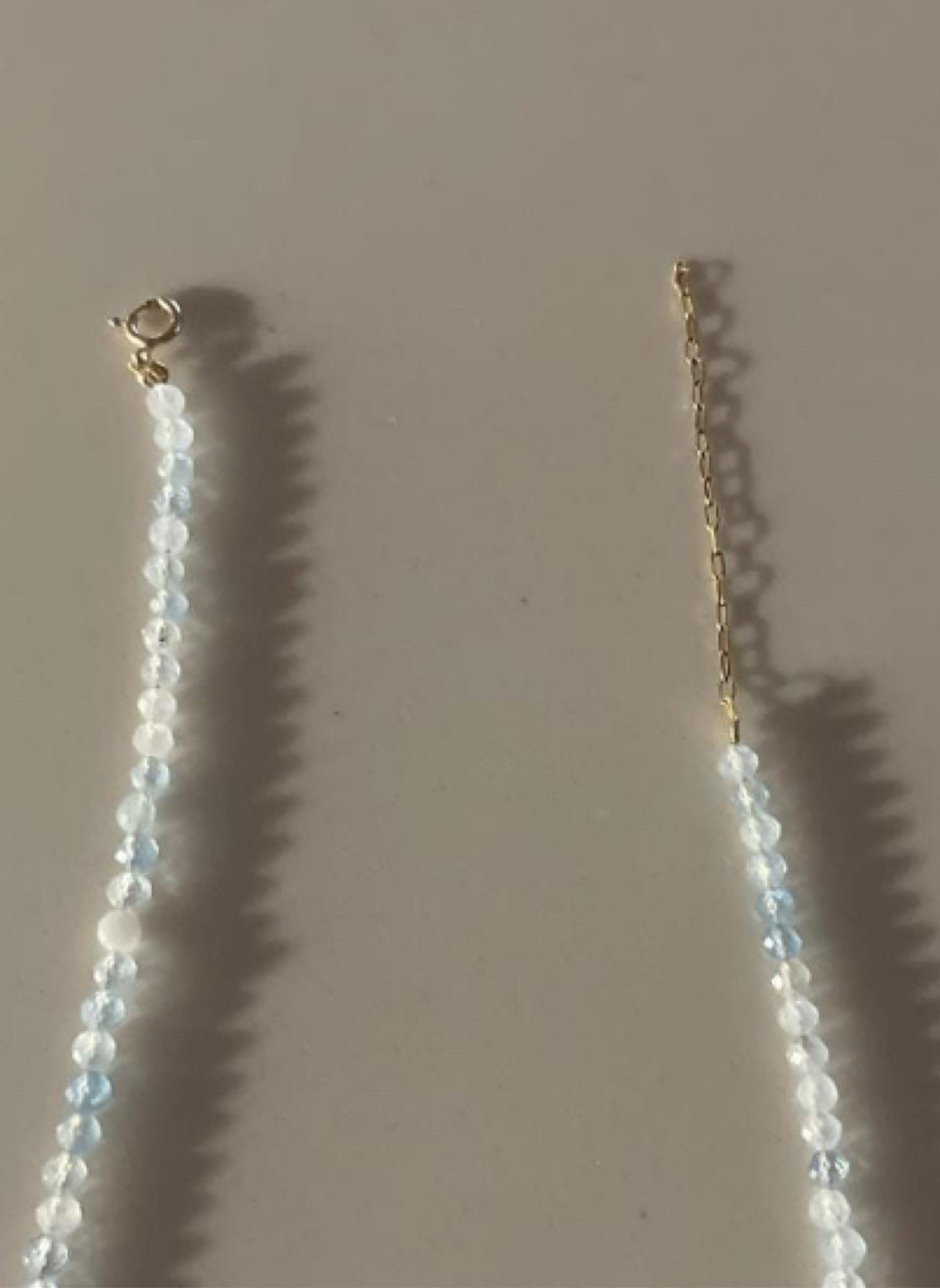 I offer 4 styles: a milky blue one and a hand-cut transparent blue and a mixed aquamarine with tourmaline, all of excellent quality. In the last photo I demonstrate an aquamarine rosary with tiny zirconia charms.