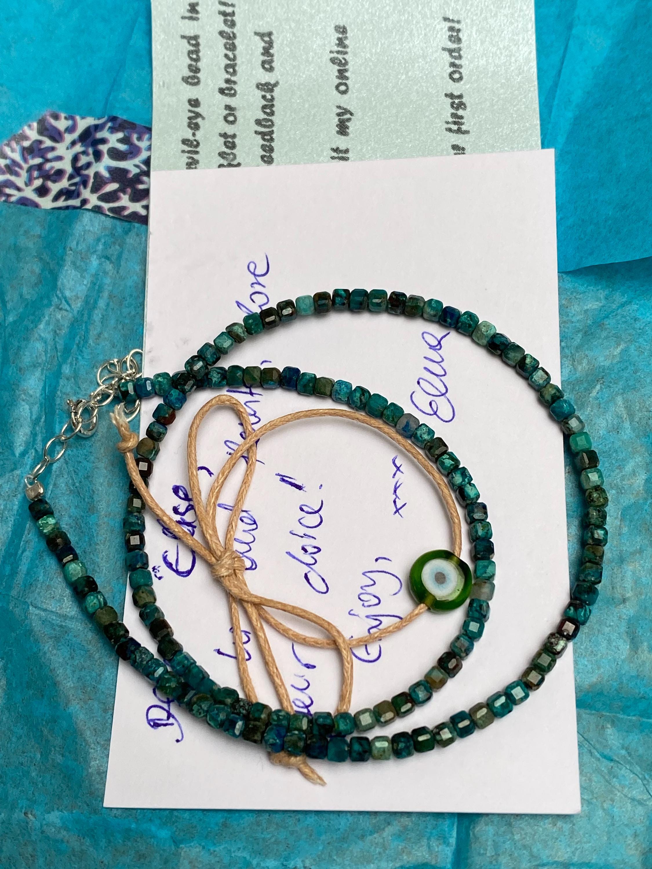 This elegant and versatile beaded choker is handcrafted using 100% natural, untreated tiny chrysocolla beads (approx. 2mm), paired with delicate sterling silver beads, chain, and closure. It’s ultra-sparkly, lightweight, and full of character—perfect for everyday wear, yet refined enough for special occasions.